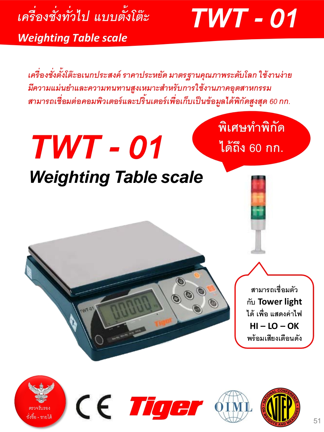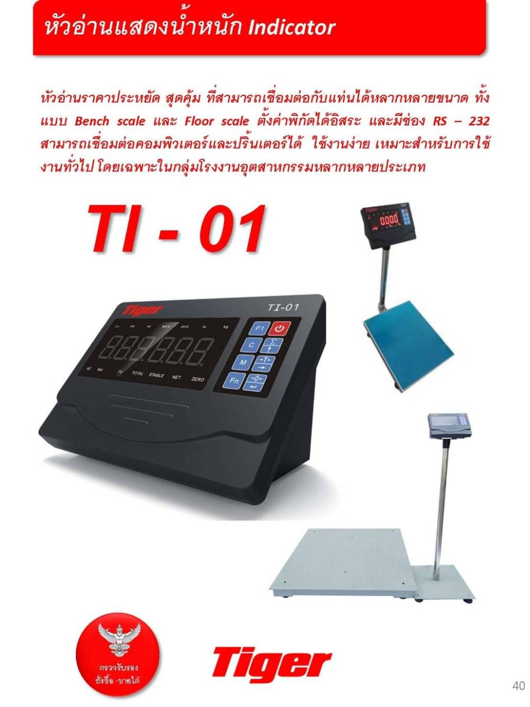 เครื่องชั่งยี่หัอ "TIGER" รุ่น "TI-01-พร้อมแท่น" หน้าจอแสดงผลเป็นตัวเลข LED สีแดง ชั่งได้ 2 หน่วย คือ kg และ lb พร้อมช่องต่อสาย RS232C ใช้แบตเตอรี่ ชนิดชาร์จไฟฟ้าได้ (Rechargeable Battery) ใช้สาย AC Adapter