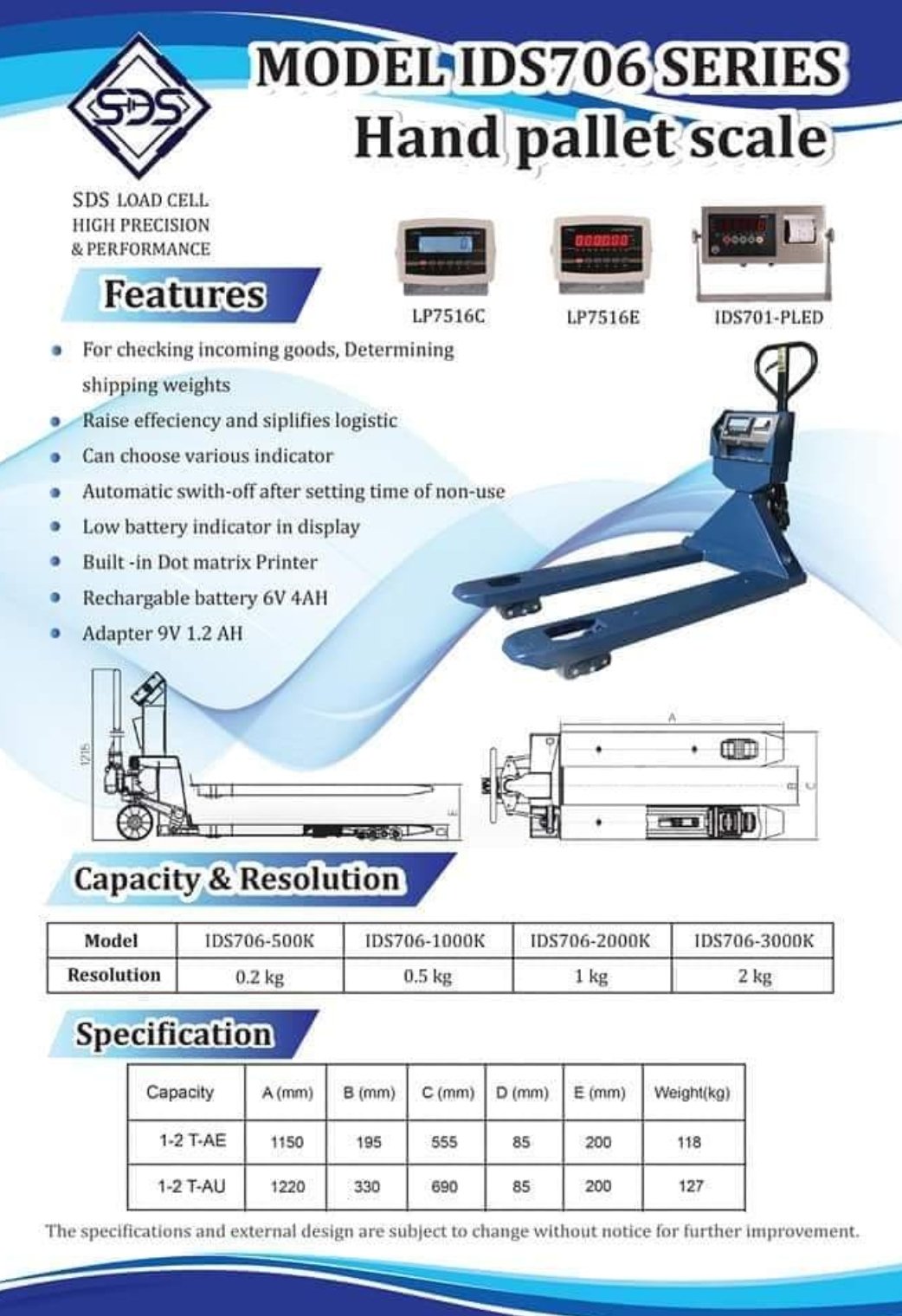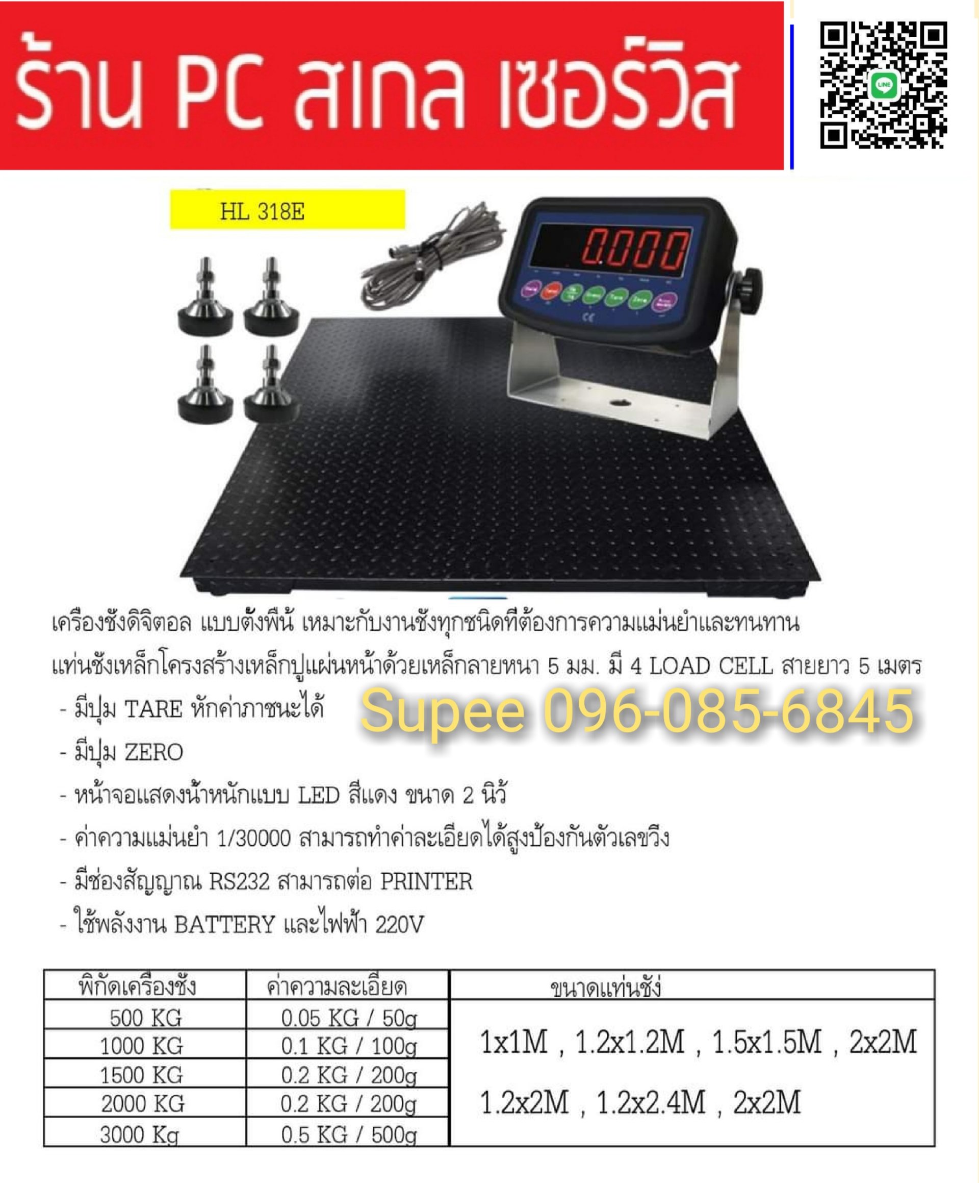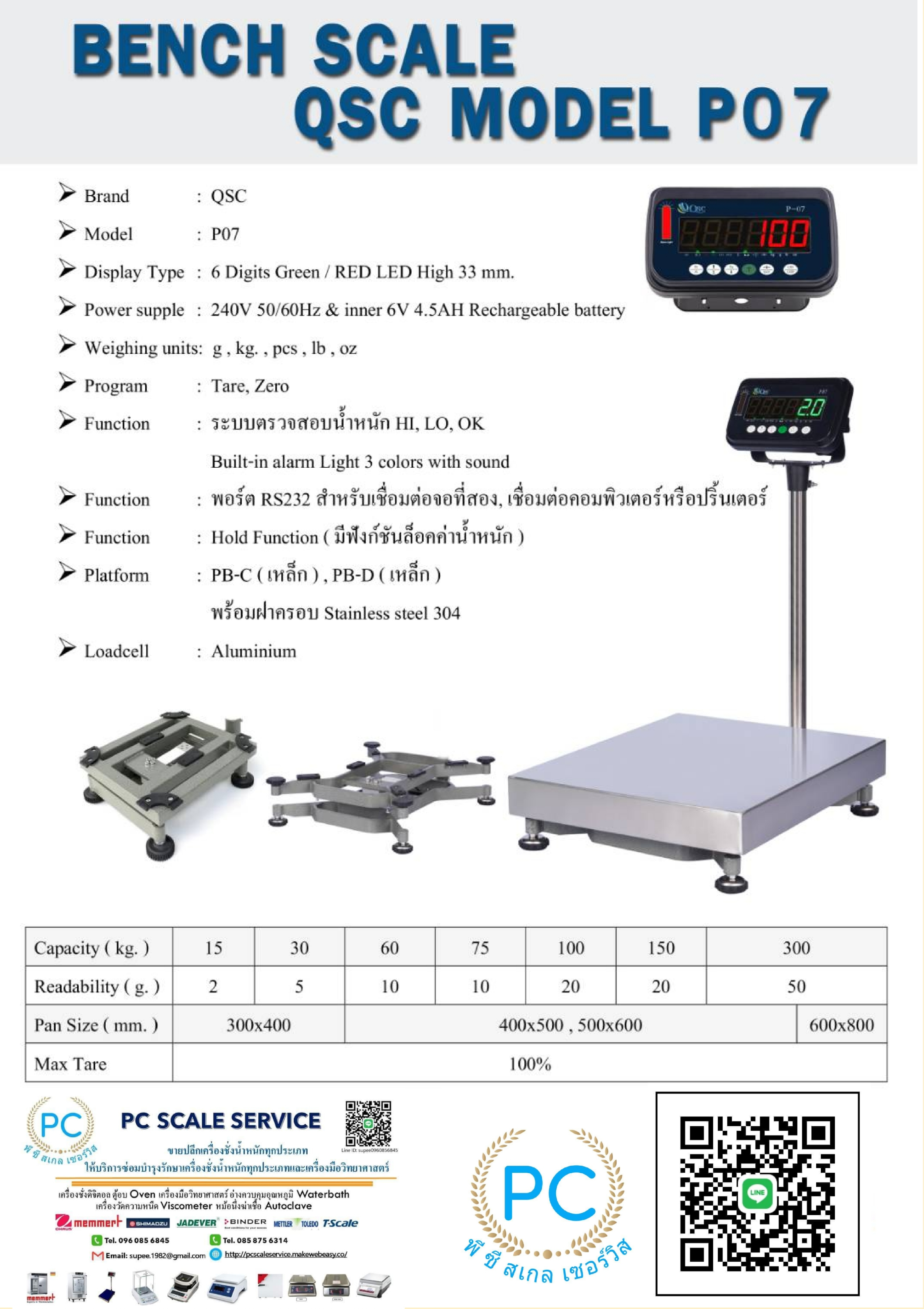 Brand : QSC Model : P07 Display Type : 6 Digits Green / RED LED High 33 mm. Power supple : 240V 50/60Hz & inner 6V 4.5AH Rechargeable battery Weighing units : g, kg., pcs , lb, oz Program : Tare, Zero function : ระบบตรวจสอบน้ำหนัก HI, LO. OK Built-in alarm Light 3 colors with sound Function : พอร์ต RS232 สำหรับเชื่อมต่อจอที่สอง, เชื่อมต่อคอมพิวเตอร์หรือปริ้นเตอร์ Function : Hold Function ( มีฟังก์ชันล็อคค่าน้ำหนัก ) Platform : PB-C (เหล็ก ) , PB-D (เหล็ก ) พร้อมฝาครอบ Stainless steel 304 Loadcell : Aluminium